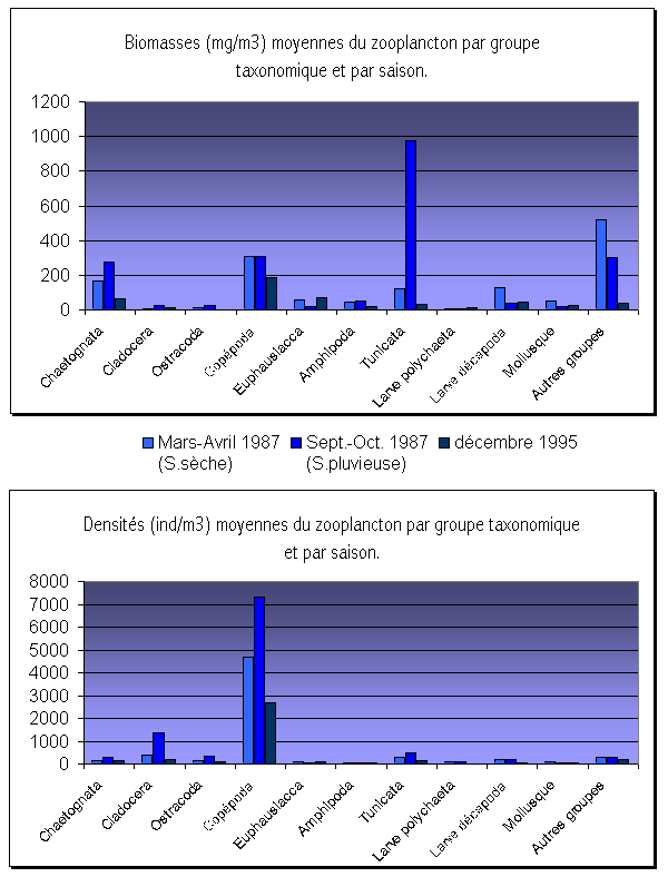 La période de développement intense du zooplancton du plateau continental guinéen correspond à la période hivernale avec une biomasse moyenne égale à 2.03 g/m3. Cette valeur décroît pendant les saisons sèche (1.5 g/m3) et (0.5 g/m3) en saison intermédiaire. Le groupe des copépodes domine largement l'ensemble en termes de densité; les biomasses se répartissent de façon plus homogène avec une prédominance des Chaetognates, Copépodes et Tuniciers.