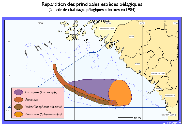 Aire de répartition de quatre grands poissons pélagiques sur le plateau continental.