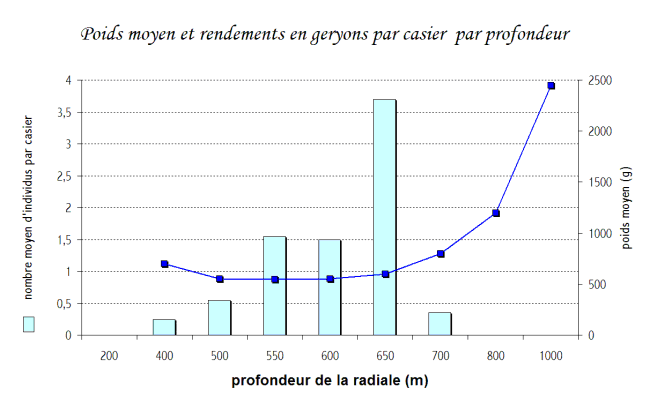 Les zones non chalutables sont des zones caractérisées par la présence de « riddins » assimilables à des affleurements rocheux de grande hauteurs (environs 5 mètres) les rendant ainsi difficilement chalutables. Les campagnes de chalutages effectuées à bord du N/O André NIZERY en 1992, 1993 et 1995 dans le cadre de l'évaluation des ressources de la ZEE guinéenne ont permis de mener une prospection expérimentale au casier de ces zones dites non chalutables. La prospection de ces espaces situés entre 200 et 1000 m a mis en évidence deux espèces de crustacés qui pourraient faire l'objet de production halieutique importante. Le crabe Geryon quinquedens et la crevette Heterocarpus laevigatus. En fonction de la profondeur et par radiale, les rendements de ces espèces varient. Les Geryons sont, toutes radiales confondues, numériquement les plus abondants entre 550 et 650 mètres de profondeurs (voir graphique). Ces mêmes profondeurs sont retenues comme les plus propices à la capture des Geryons en Angola, en Côte d'Ivoire, au Congo et aux Seychelles. Les Heterocarpus laevigatus sont présentes entre 500 et 1000 mètres. Cependant, les meilleurs rendements sont obtenus autour de 600 m.