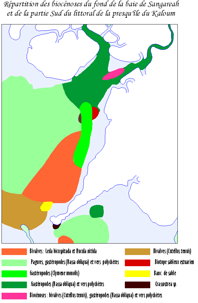 Les recherches sur les biocoenoses du fond ont été menées dans la baie de Sangaréah jusqu'à la partie sud de la presqu'île du Kaloum et dans la partie supérieure de l'archipel de Loos. Au total, 124 stations ont fait l'objet d'investigations. De la baie de Sangaréah à la presqu'île de Kaloum, on note les biocoenoses principales suivantes : - Biocoenose Cultellus tenuis + Nassa obliqua + Polychètes - Biocoenose Pagures + Nassa obliqua. Dans l'archipel de Loos, les principales biocoenoses sont les suivantes : - biocoenose Phacoïdes lamothei, Clibanarius senegalensis (Pagures) - biocoenose Amphioplus congensis (ophiures).